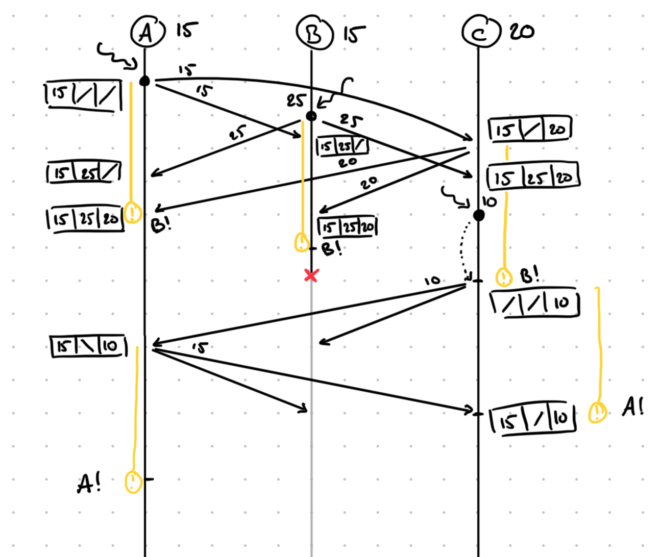 T=1 : A demande une électionT=2 : l'aptitude de B devient 25T=2 : B demande une électionT=5 : l'aptitude de C devient 10T=5 : C demande une électionT=7 : B tombe en panneExercice - Solution