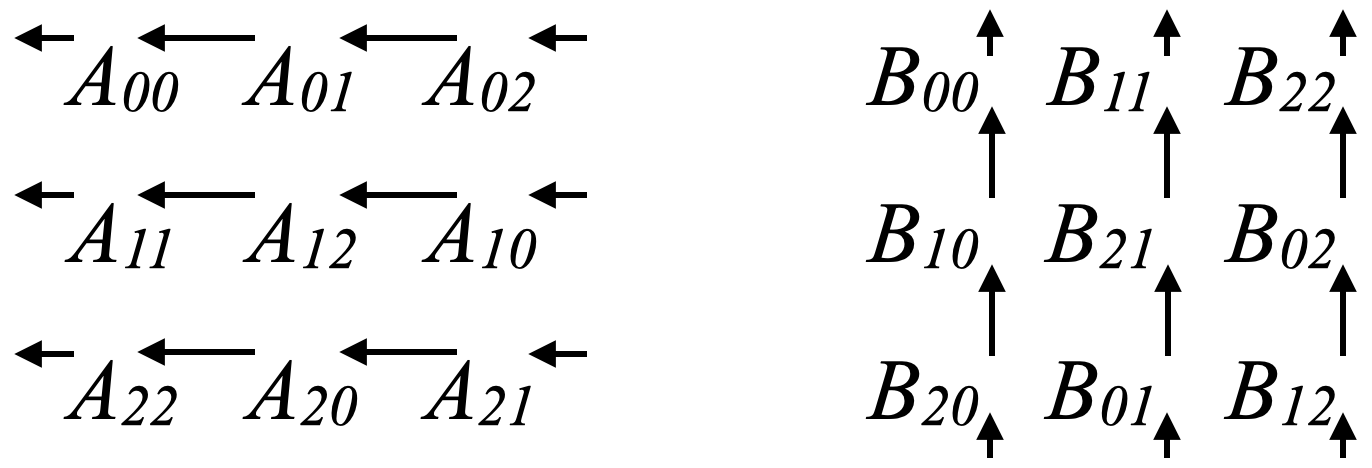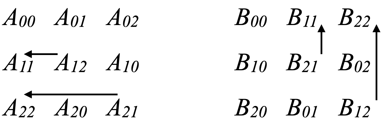 Aik = A[i][(i+j)%n]Bkj = A[(i+j)%n][j]Cij = 0Pseudocode